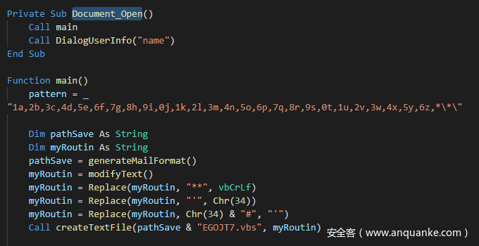 宏代码启用后,会自动执行Document_Open()方法,调用main和DialogUserInfo