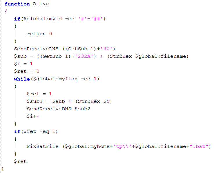 初始化时首先会判断$global:myid是否为 ### ,如果是,则说明是该后门第一次启动或表明myid变量没有成功赋值,在这种情况下,程序会调用GetId函数尝试通过SendReceiveDNS对C2发起请求以获取dns服务器,使用SendReceiveDNS函数的返回值给myid变量赋值。然后尝试将新的myid替换掉该ps文件中的’###’符号。