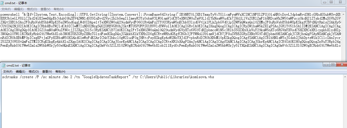 其中cmd2命令比较简单,主要是设置了一个名为GoogleUpdatesTaskReport的计划任务,该计划任务每两分钟执行一次,用于启动komisova.vbs文件