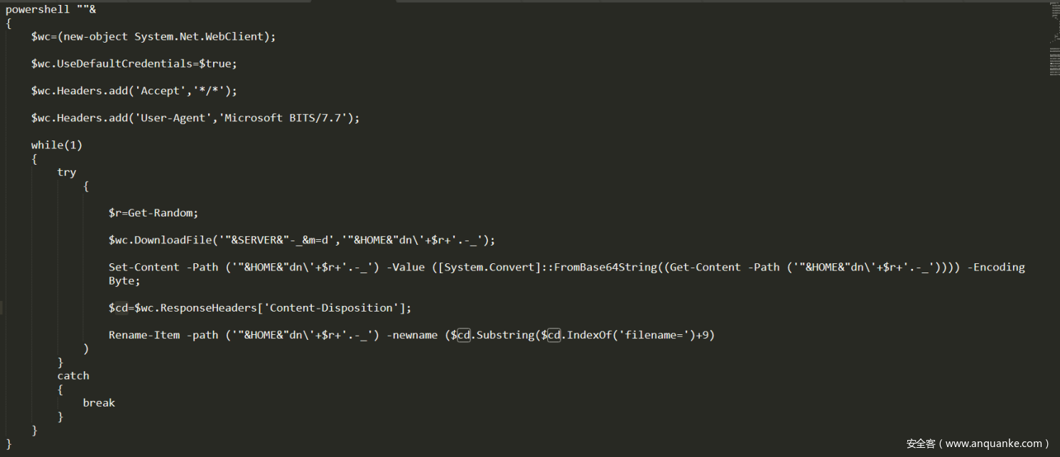 vbs中内嵌了两段powershell代码,第一段powershell代码用于下载文件并将其保存到先前创建的dn目录中