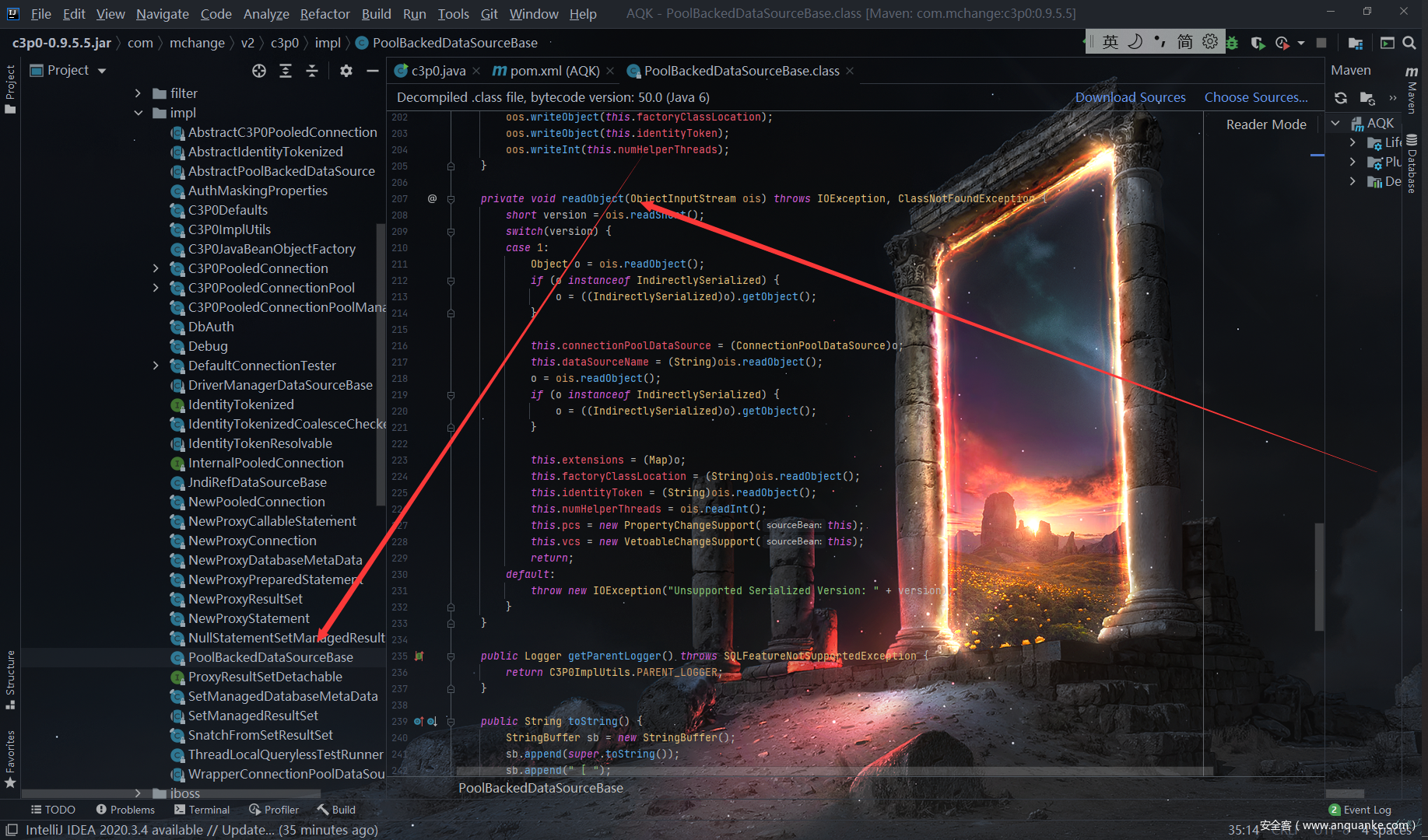 直接进入网上公开的链条类打开就是一顿分析com/mchange/v2/c3p0/impl/PoolBackedDataSourceBase