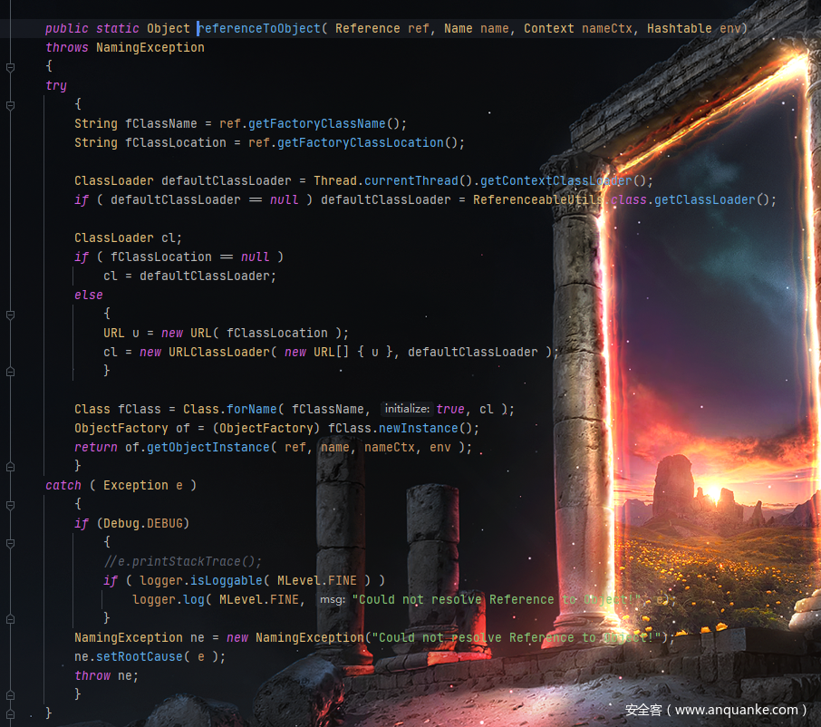 reFerenceToObject根据Reference对象来获取工厂类的名字,以及工厂类的地址,接着拿到类加载器,拿到appClassLoader(一般程序中类加载都用这个,它的上面还有jre核心类运行的加载(rt.jar)bootstrap classloader和扩展类加载ext classloader)