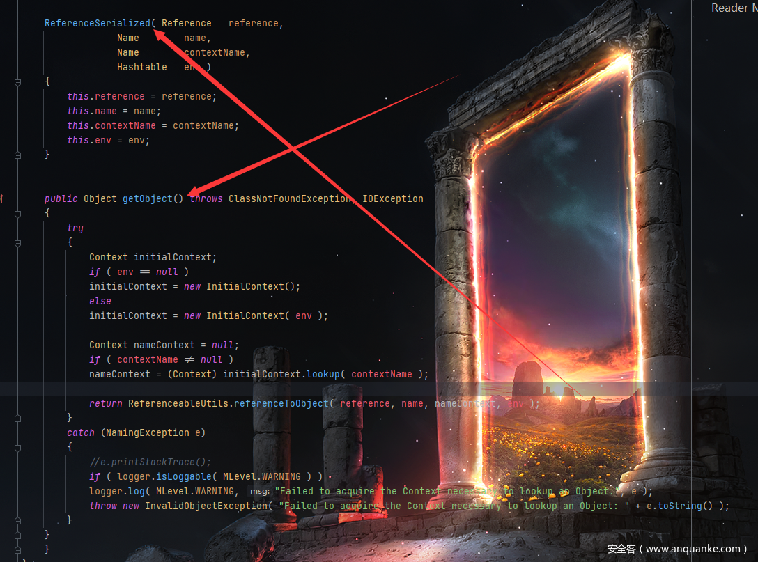 此语句反序列化出一个referenceSerialized对象,instanceof关键字用来测试一个对象是否为一个类的实例。com.mchange.v2.naming.ReferenceIndirector类中存在内部类ReferenceSerialized实现了IndirectlySerialized接口,所以类型比对通过。