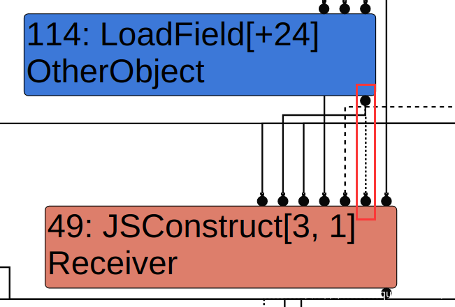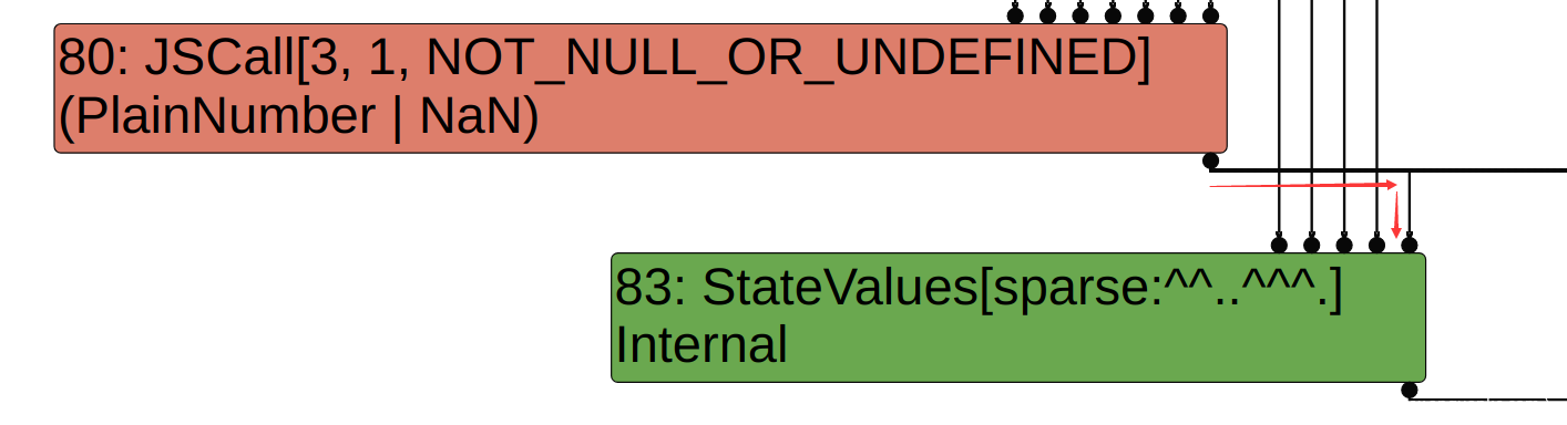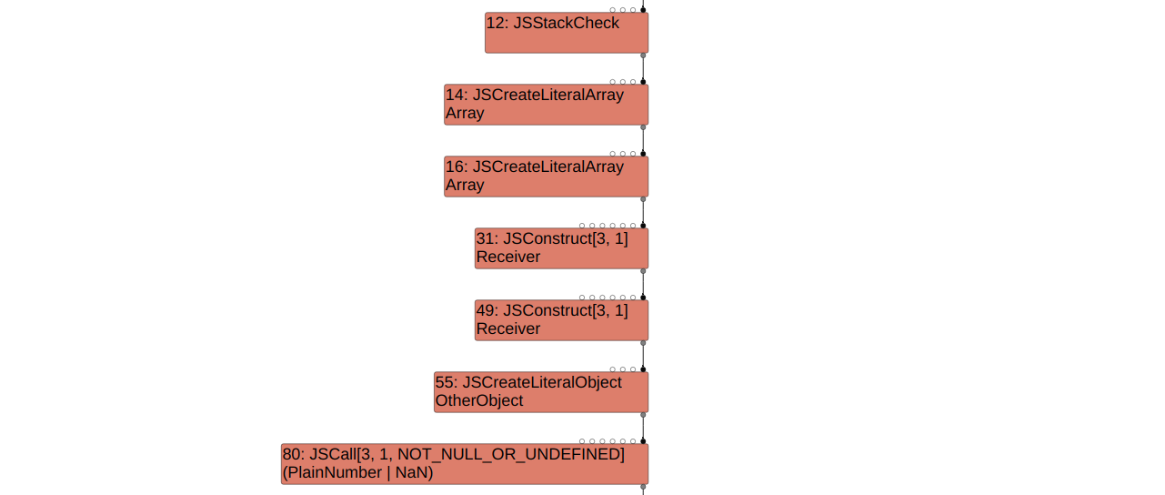 { "function": "opt_me", "sourcePosition": 109, "source": [js source], "phases": [ { "name": "Typed", "type": "graph", "data": { "nodes": [ [...], { "id": 20, "label": "FrameState[INTERPRETED_FRAME, 11, Ignore, 0x1a5acd4aa5e9 <SharedFunctionInfo opt_me>]", "title": "FrameState[INTERPRETED_FRAME, 11, Ignore, 0x1a5acd4aa5e9 <SharedFunctionInfo opt_me>]", "live": true, "properties": "Idempotent, NoRead, NoWrite, NoThrow, NoDeopt", "pos": 178, "opcode": "FrameState", "control": false, "opinfo": "5 v 0 eff 0 ctrl in, 1 v 0 eff 0 ctrl out", "type": "Internal" }, [...] ], "edges": [ { "source": 100, "target": 101, "index": 0, "type": "control" }, [...] ] } }, [...] ], "nodePositions": { [...] } }简单的概括一下,就是: - function: 函数名称