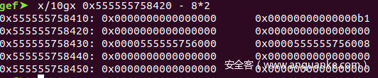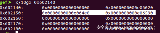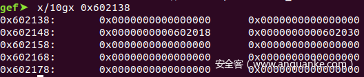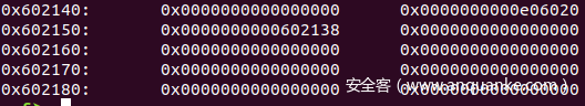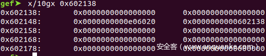 可以看到我们存储heap指针的地方已经变为了0x602150 – 3 8 = 0x0x602138