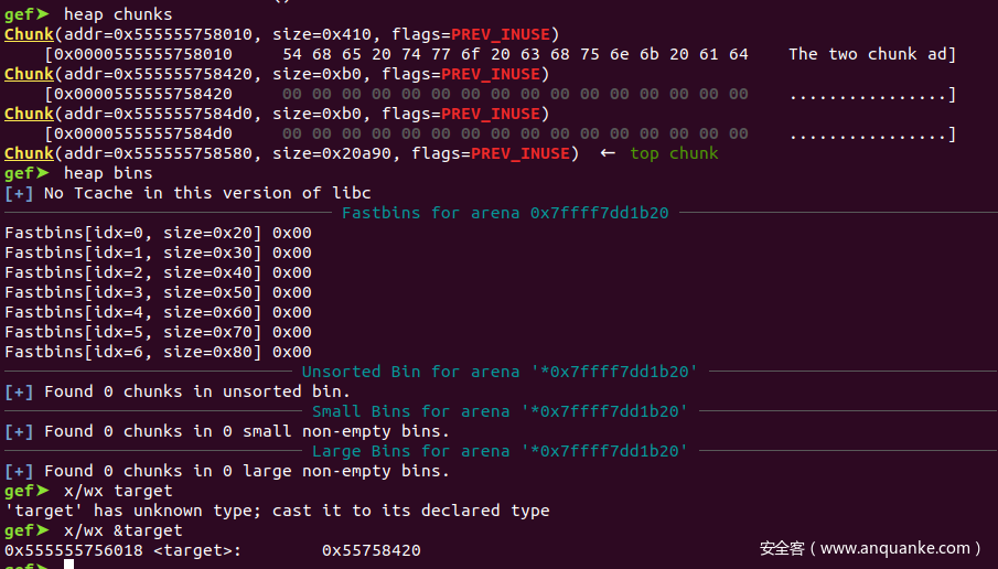 target所在地址为bss全局变量区上的,存储的是ptr0指向的chunk1的地址0x5578420,与我们通过heap chunks观察到的地址相同。