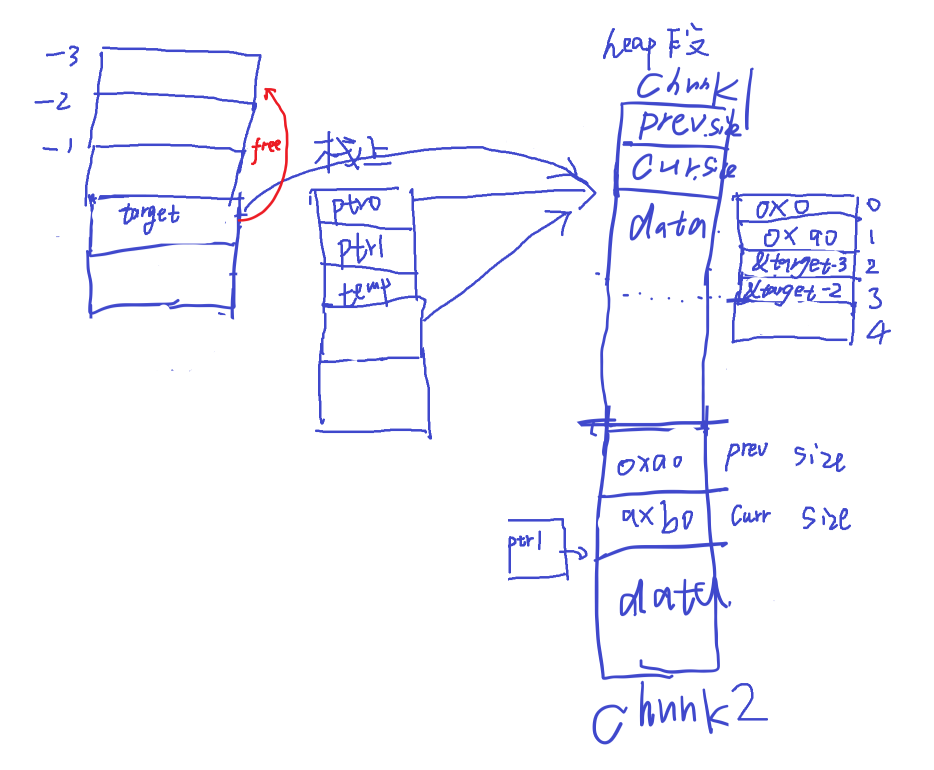 p = chunk_at_offset(p, -((long) prevsize)); // 这个指向的是0x5555557584c0 - 0xa0 = 0x555555758420 就是target[0]的内存地址