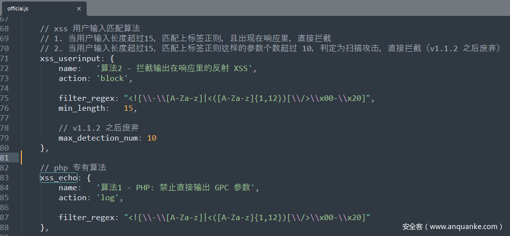 openrasp xss算法有2种。算法1是针对PHP环境,此处不考虑。算法2是用户输入匹配算法,根据注释说明,算法原理是”当用户输入长度超过15,匹配上标签正则,且出现在响应里,直接拦截”。