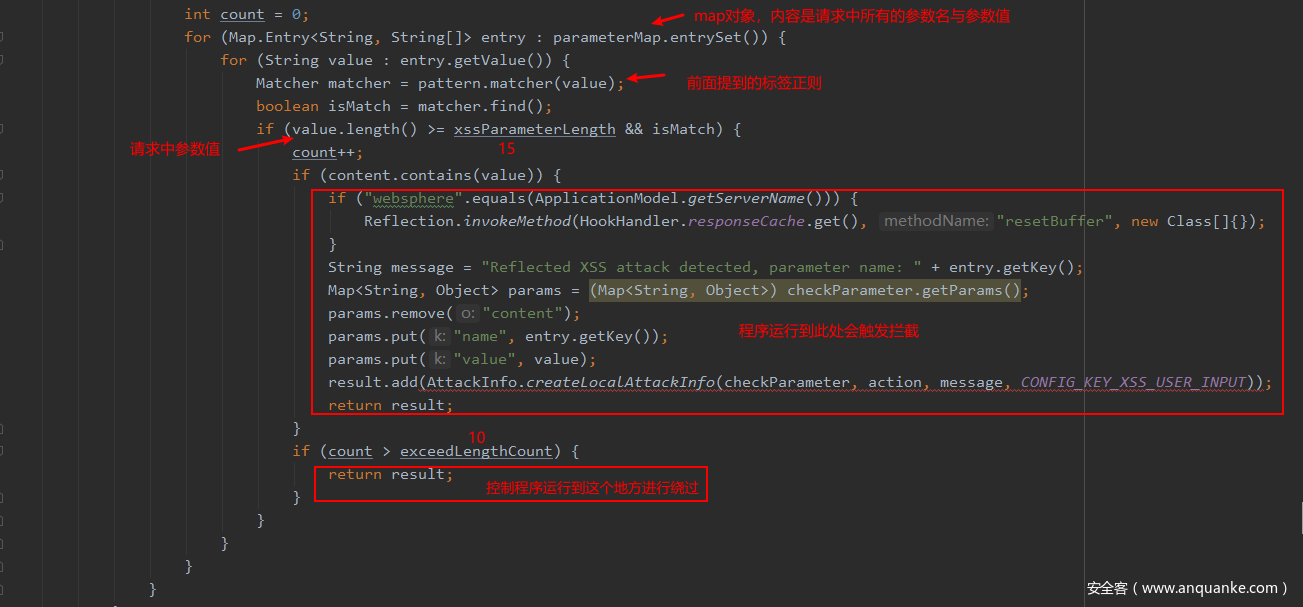 但代码中多了一处逻辑。如果请求会传递多个参数,当某个参数值长度大于15,且匹配之前的标签正则<![\-\[A-Za-z]|<([A-Za-z]{1,12})[\/\x00-\x20>] ,如果对应参数值没有在响应中出现时,变量count值会加1。当count值大于10时,openrasp会直接放行。控制程序运行到上面图片中第二个方框中即可产生绕过。