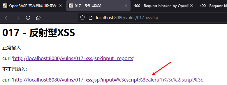 在official.js中xss_userinput算法默认配置为ignore,修改为block来开启拦截。此时点击官方测试用例中下面链接,即可触发openrasp拦截。