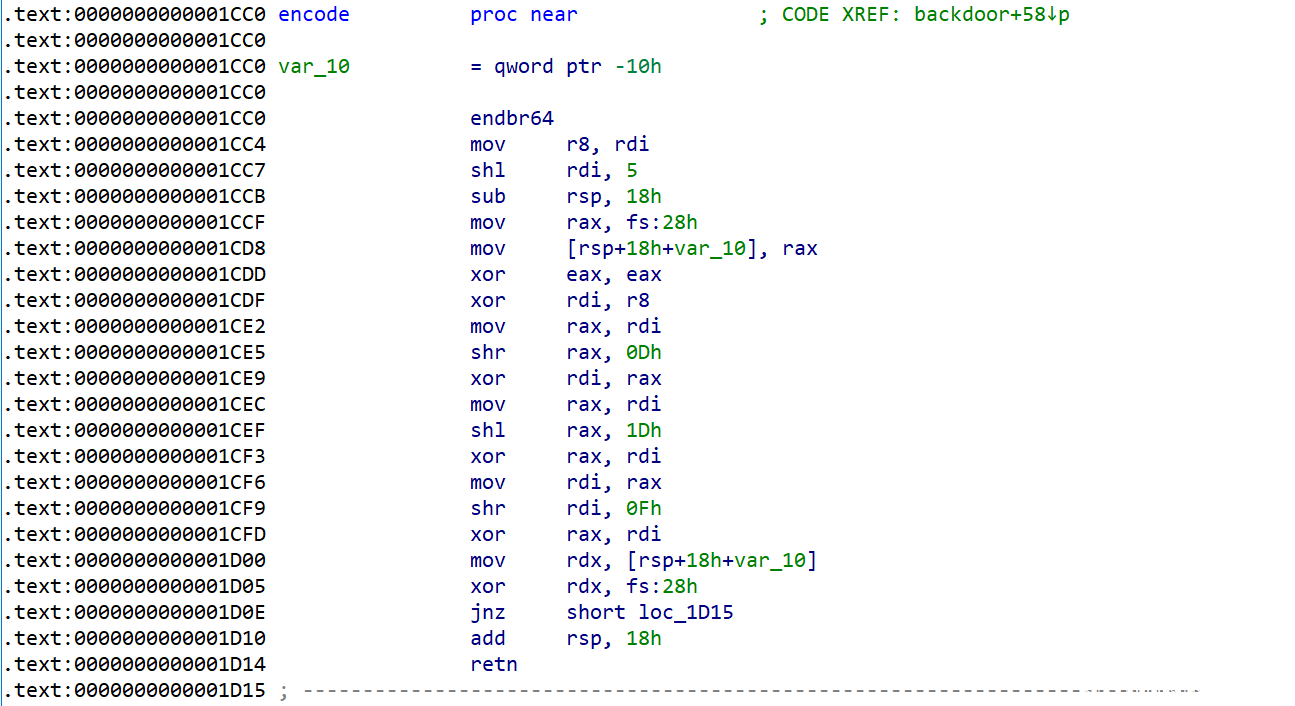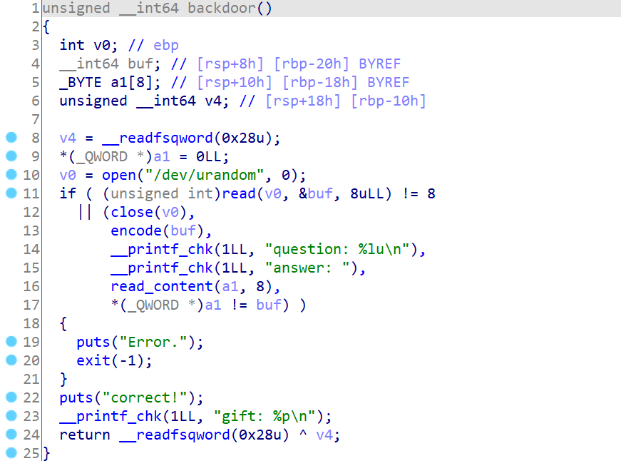 backdoor 函数实际上在做的就是读取8个字节的随机数,然后把随机数使用encode函数进行加密,并且输出加密后的内容,要求你回答加密前的内容并进行校验。