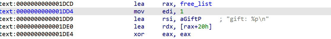 如果回答正确就可以获得一个free_list的地址,这个地址存放在bss段上,我们也可以借此来泄露出PIE基址。