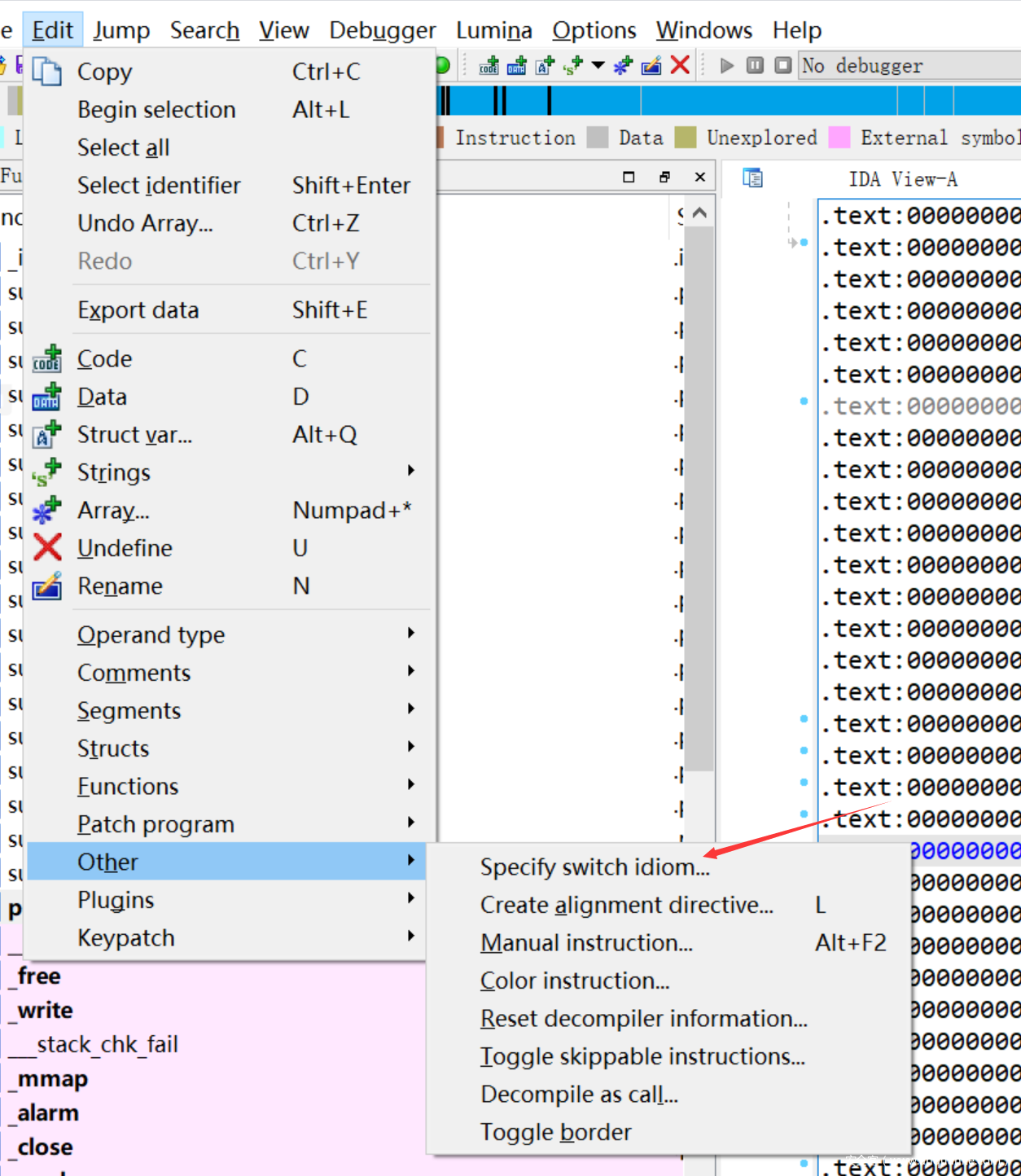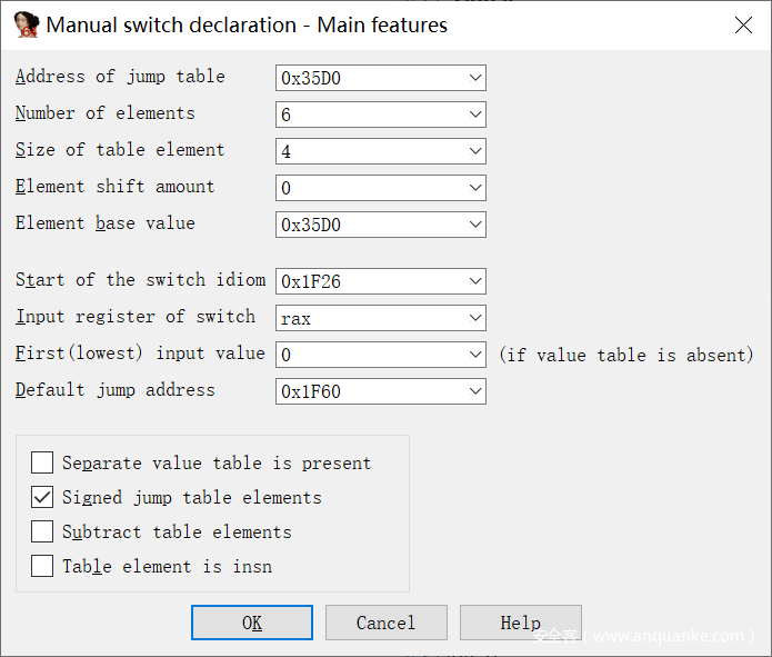 大概是因为IDA官方也知道自己的程序对于某些switch的识别存在问题,所以提供了一个自带的工具(Specify switch idiom)让我们来辅助IDA完成识别