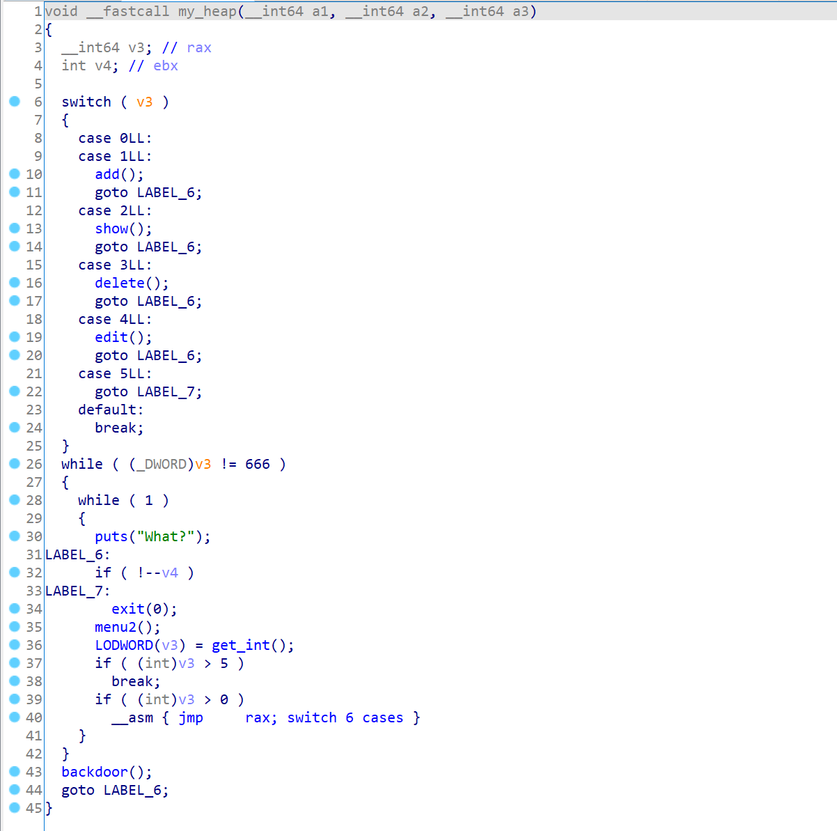 在这部分代码中,我们很容易的就可以看到当我们输入666的时候可以跳转到程序的backdoor函数,这一般都是必须会用到的重要功能,一般这个函数的内容可以辅助我们找到程序的漏洞的大致方向。