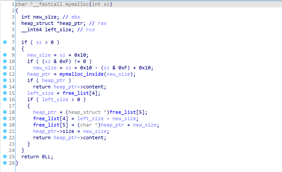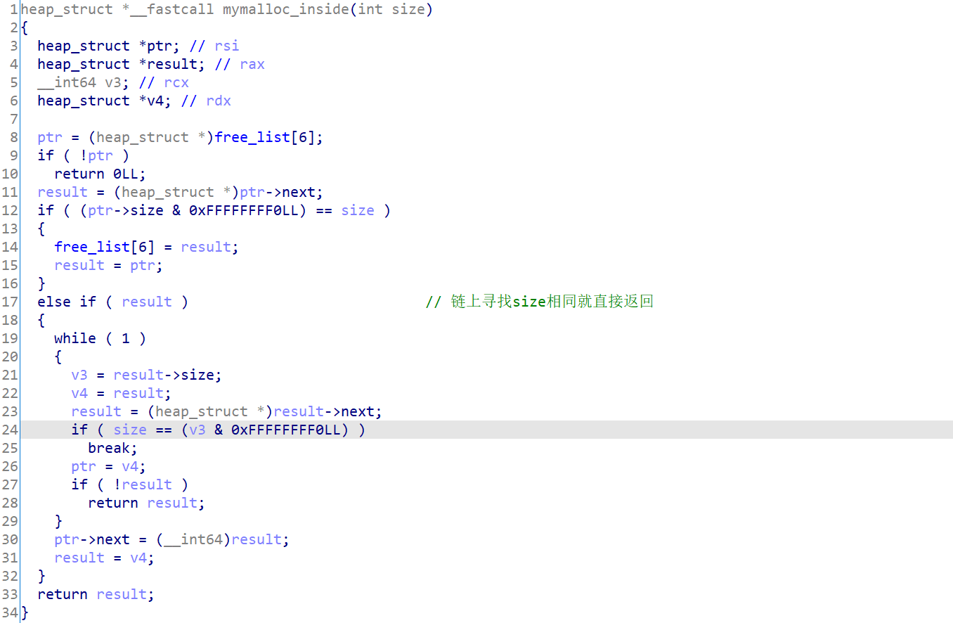 在程序的malloc函数中,我们发现有一个函数会遍历释放的堆块链表,并且从链表头部依次往下寻找,直到找到一个和申请size相同的释放堆块就返回,如果没找到就会从剩余空间中申请。