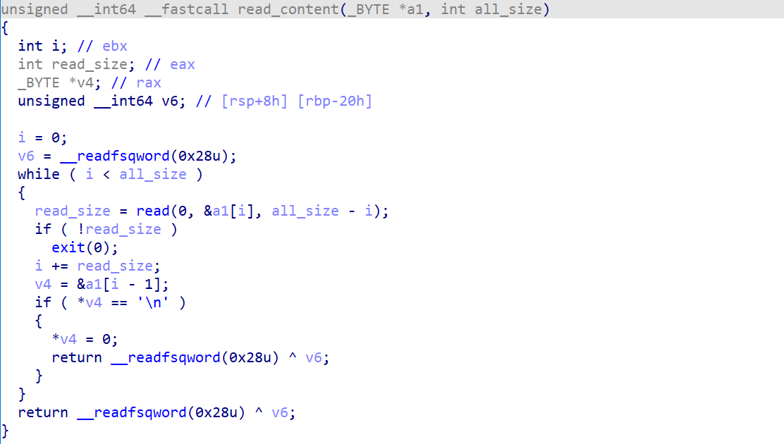 看到了上面的漏洞之后,也算是有了个大概的方向,我们想办法能够触发这个漏洞,那接下来需要分析的就是read_content函数(0x00000000000014C0)