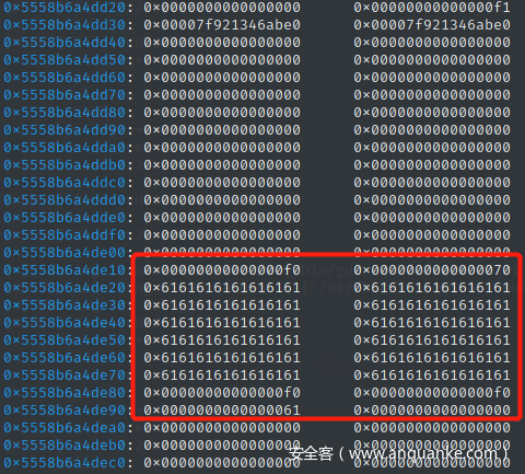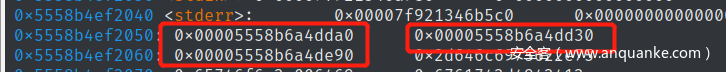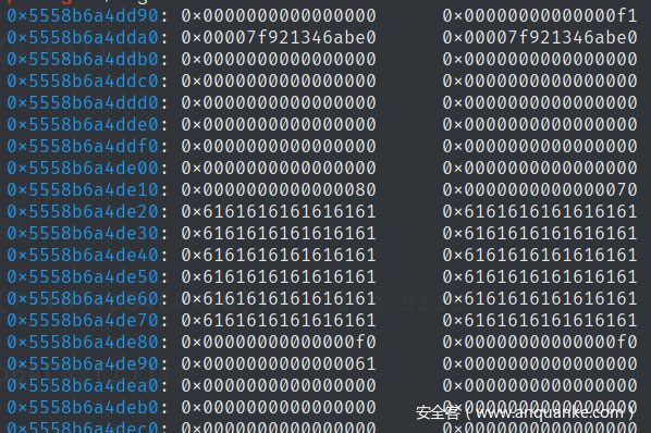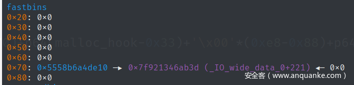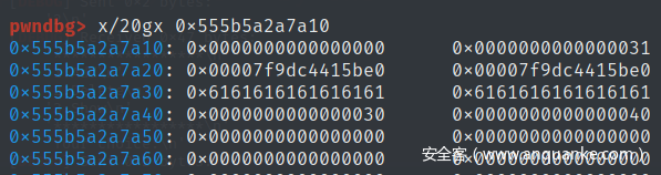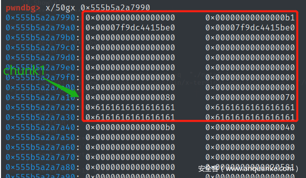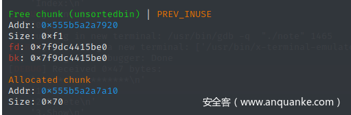 从上一张图中能看到,chunk1的size被改为了0x31,chunk0是用来修改unsorted bin的size的0x71大小的chunk。