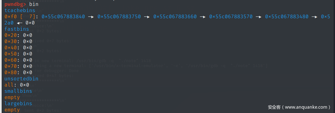 首先将0xf1的tcache打满,因为calloc不会从tcache中取chunk,所以直接循环就可以将tcache打满。