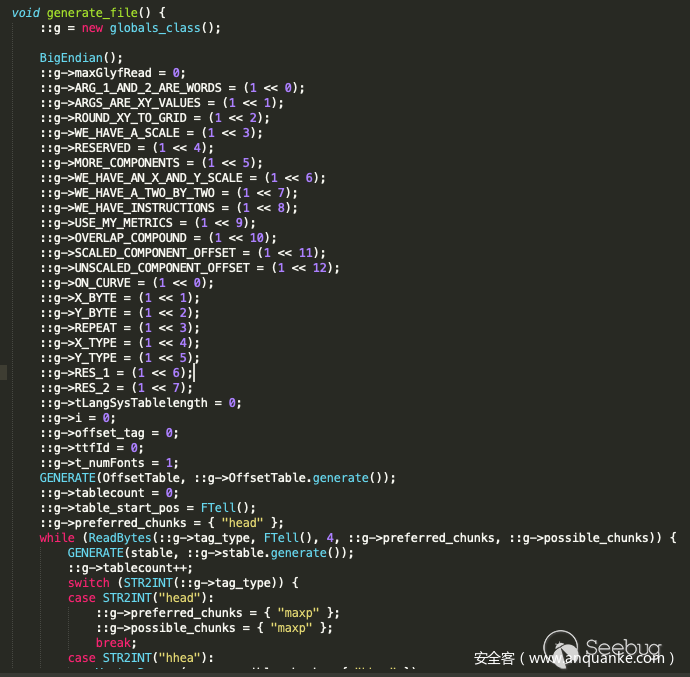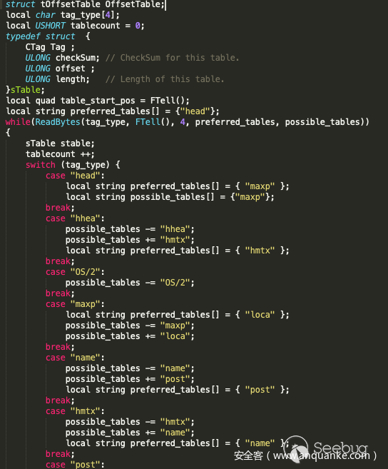 Formartfuzzer fuzzing我就不做过多介绍了,简单的来说,它就是以010 Editor众多结构模板为基础来生成与构造所需的各种结构数据,再通过对数据做一些变异算法来生成最终的畸形数据,Formartfuzzer 现在支持结构有:avi、bmp、gif、jpg、midi、mp3、mp4、pcap、png、wav、zip等,作者们还在继续编写中,既然010 Editor支持上百种结构,而这里只有10多个呢,因为010 Editor只是一个做了解析的软件,而Formartfuzzer 不仅做了解析,而且通过模板结构生成了可用的相关结构数据,所以没法直接使用010 Editor的模板,还需要做很多工作,再熟悉了Formartfuzzer 后,我决定自己修改一种模板结构,我将目标定为了ttf结构,这是一种字体结构,可以说字体结构也是相当复杂了,并且选择字体也和我最近的工作有些许联系。