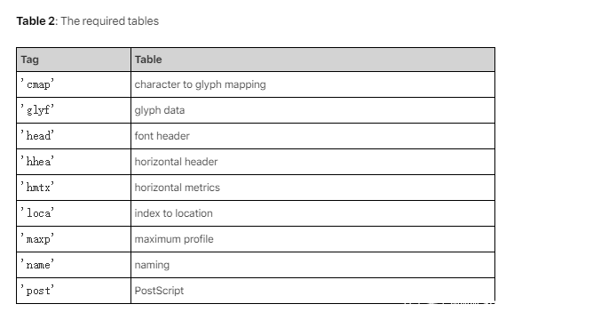 ttf结构的描述可以参考苹果或者微软的链接,这里我们参考苹果的链接[3],ttf结构主要是以众多的table表构成,每个table表直接有相关的联系,所有的table表加起来有大概40多个,在苹果字体的描述中,以下的几个table表是必须构成字体的9个table表: