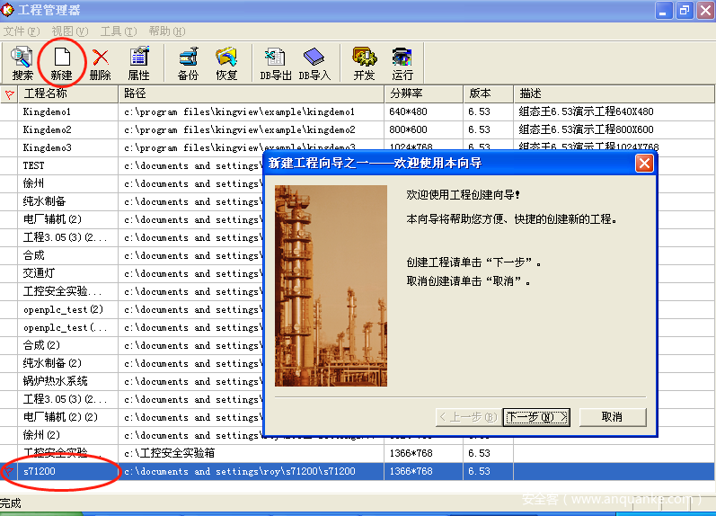 1)在Windows XP 虚拟平台打开组态王6.53,新建一个工程,名称及路径可自定义,如下图: