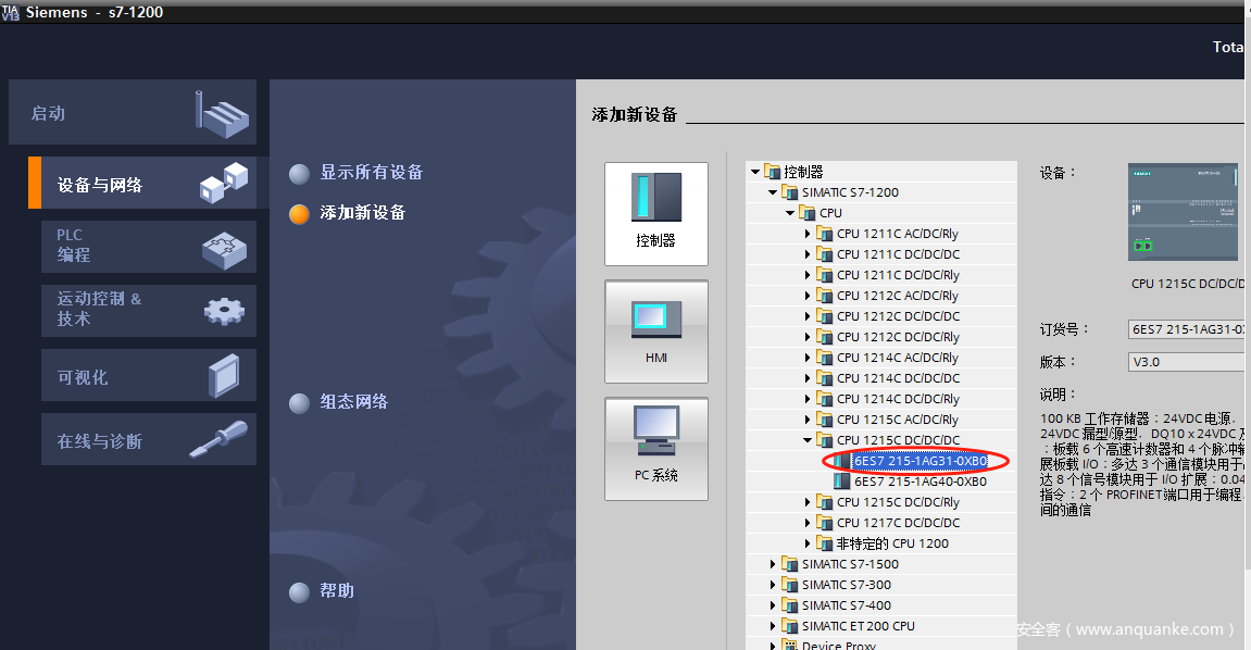 2)选择组态设备,添加新设备,选择和真实设备型号一致的硬件,如下图: