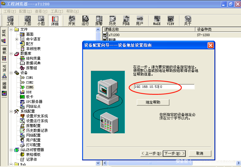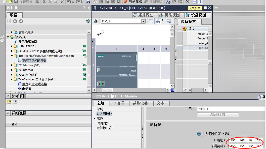 5)双击左侧列表的设备组态,再点击下图中PLC的接口,接着定义PLC的IP地址,如下图: