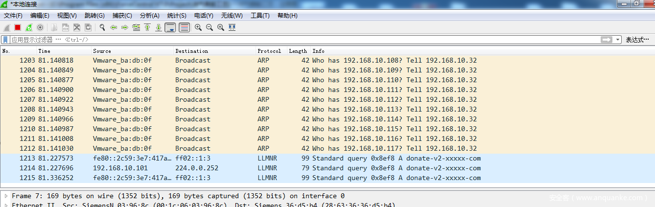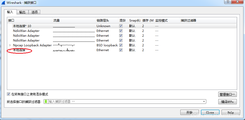 1)在win7虚拟机机中打开wireshark软件,选择数据捕获接口,如下图: