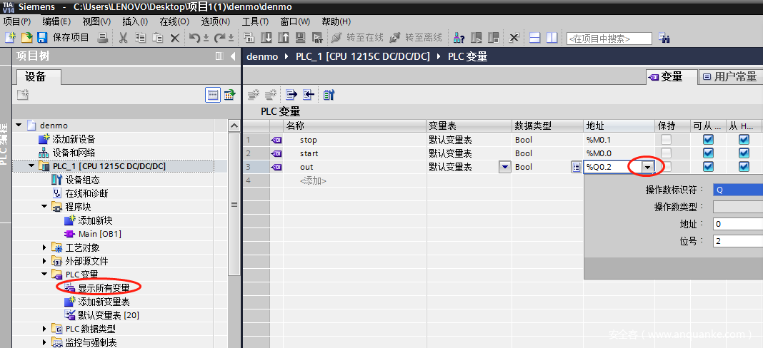 3)建立start、stop、out分别对应上位的通道地址M0.0、M0.1、Q0.2,如下图: