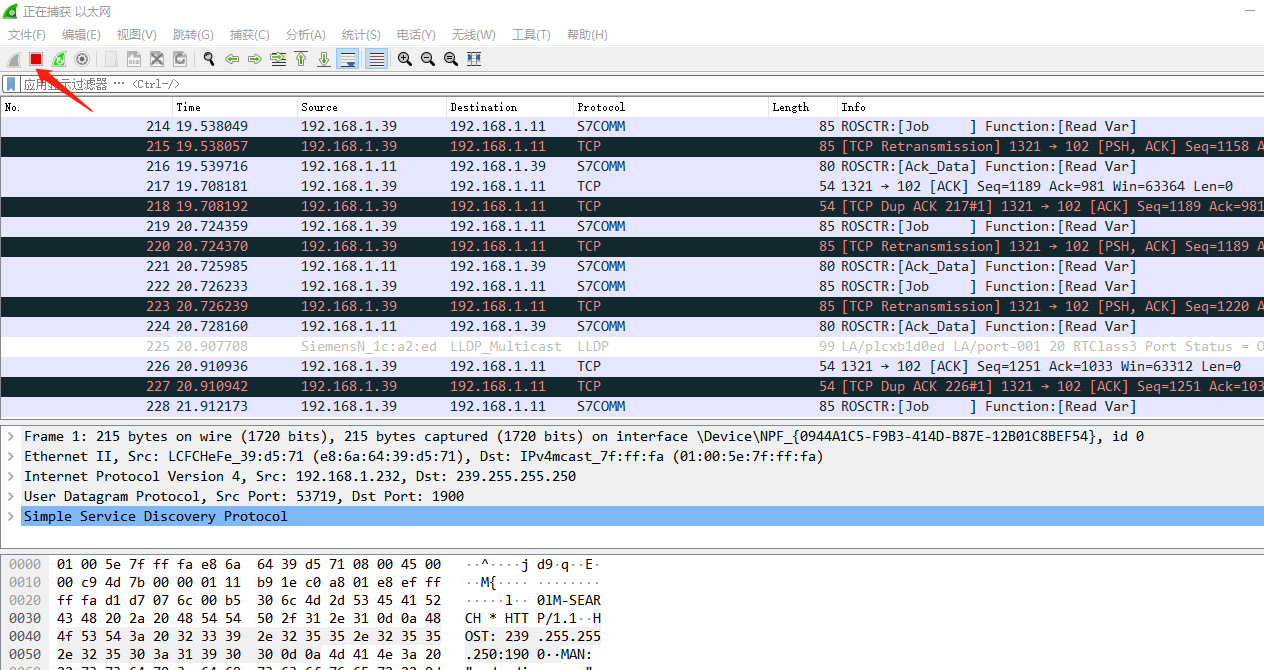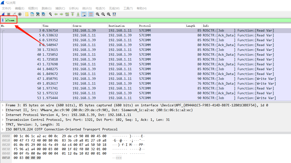 1)在保存的数据包中进行数据过滤,应用显示过滤器中输入s7comm进行数据过滤,如下图: