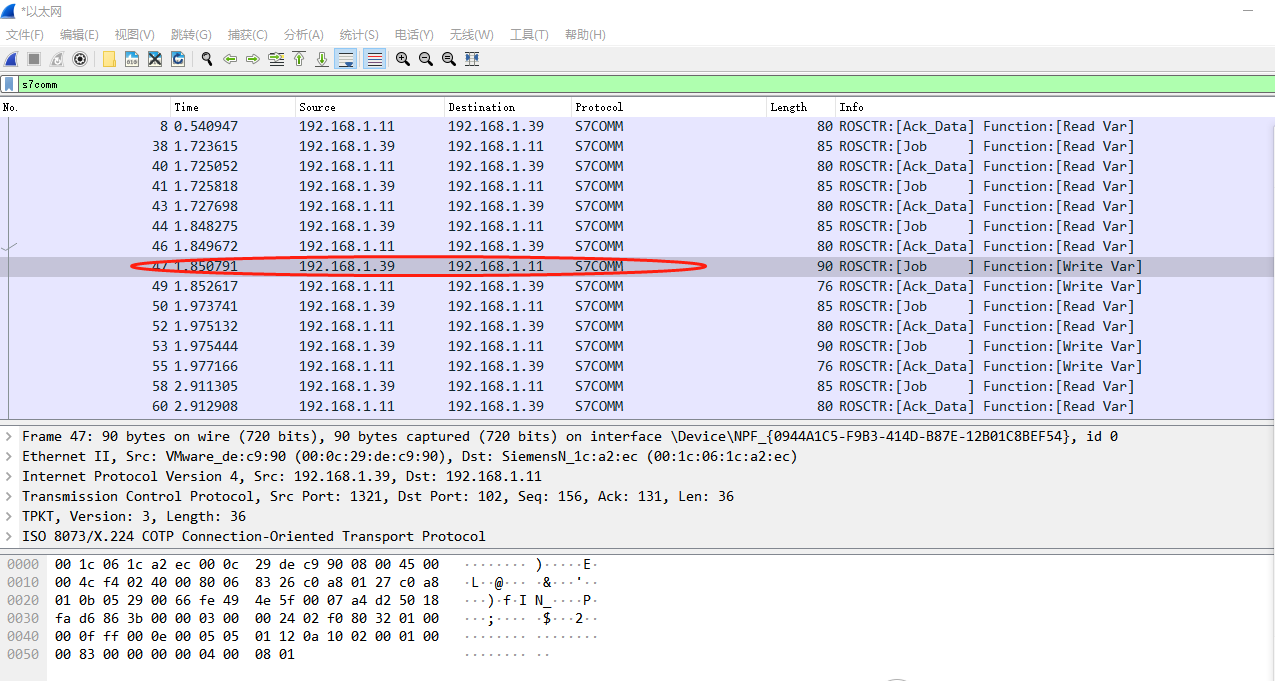 2)找到功能码为写变量的数据包,源地址为win7虚拟机IP(192.168.1.39),目的地址为PLC的IP(192.168.1.11),如下图: