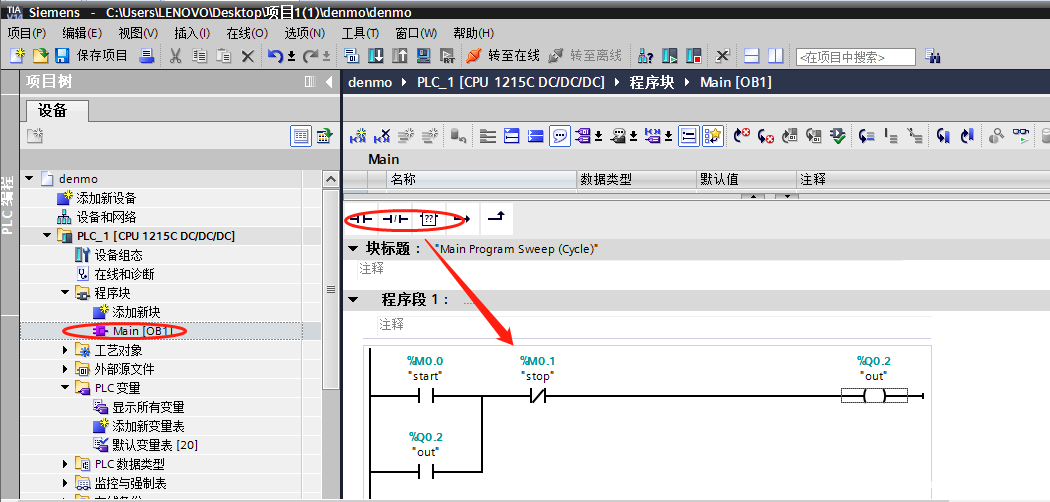 下图是PLC的一个简单的设备启停控制逻辑程序,%M0.0、%M0.1是指PLC的M类型的寄存器,0.0、0.1是M寄存器的某两个偏移地址,对应中间变量。%Q0.2是PLC的Q类型的寄存器,0.2是Q寄存器的某个偏移地址。在这个控制程序中,%M0.0(变量名为start)对应是监控画面上的启动按钮,进行对电机的启动操作,%M0.1(变量名为stop)对应是监控画面上的停止按钮,进行对电机的停止操作。%Q0.2(变量名为out),对应PLC的DO输出,即将控制信号输出给设备。
