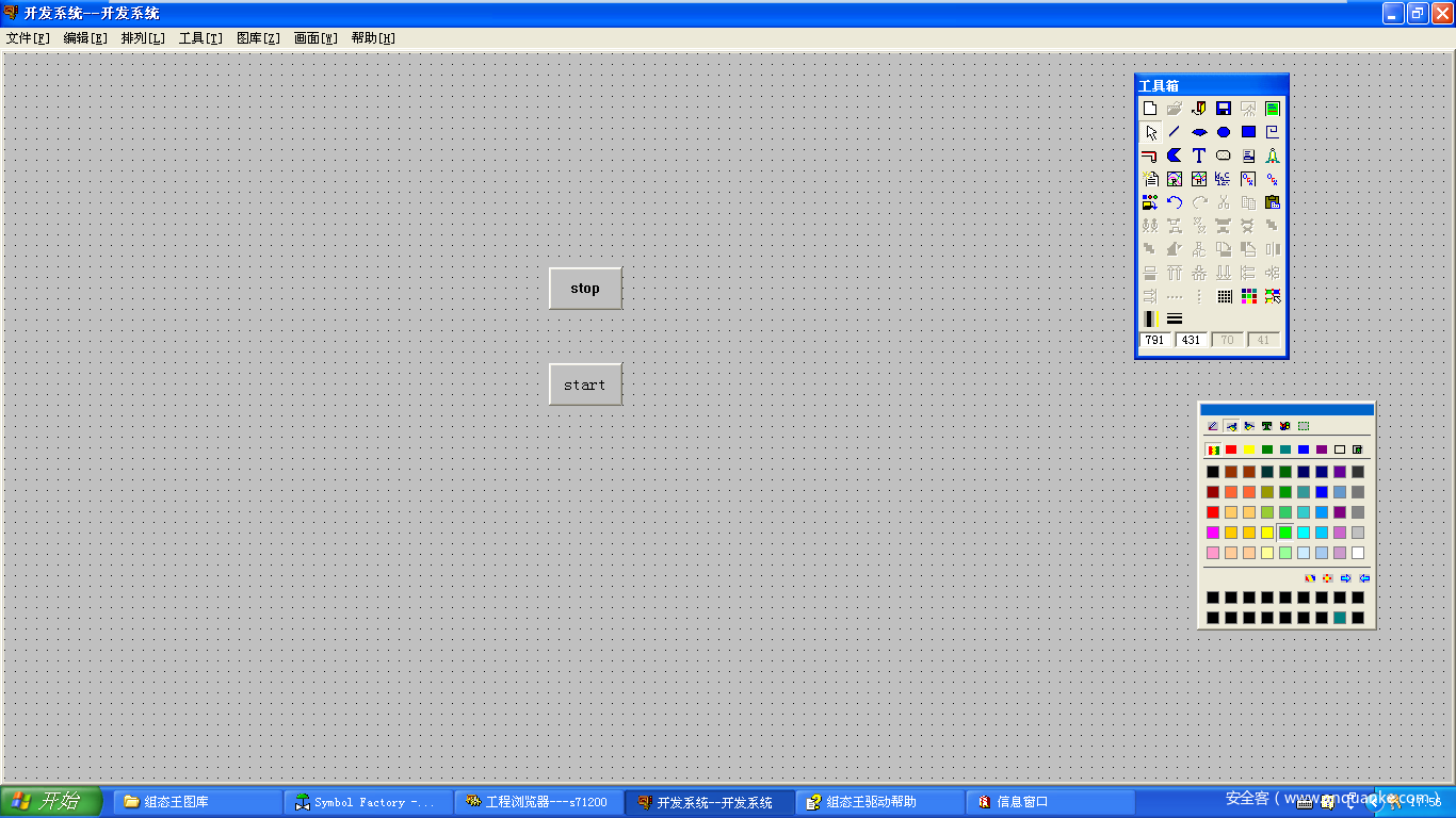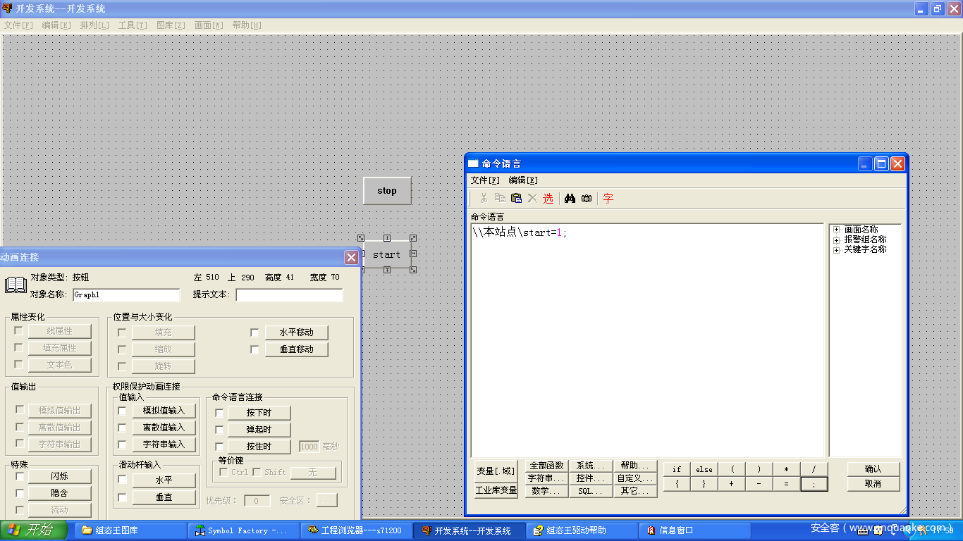 10)在s71200画面下,增加2个按钮,分别字符串替换为start、stop,对按钮进行按钮的动画连接,按下时变量赋值1,弹起时变量赋值0,如图: