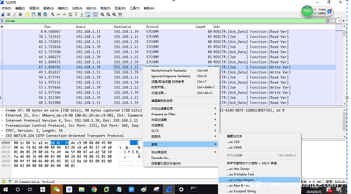 3)在wireshark中将数据包复制下来,具体操作为选中要复制的包右键复制>as a Hex Stream,如下图: