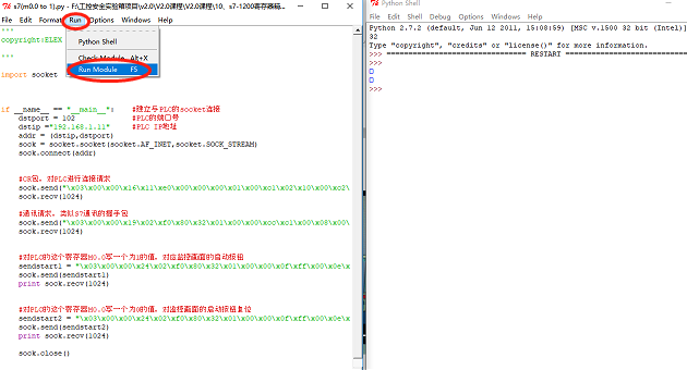 6)数据构造完成,在S7(M0.0 to 1)攻击测试脚本中选择Run>Run Module 或者直接快捷键F5发送数据包,如下图: