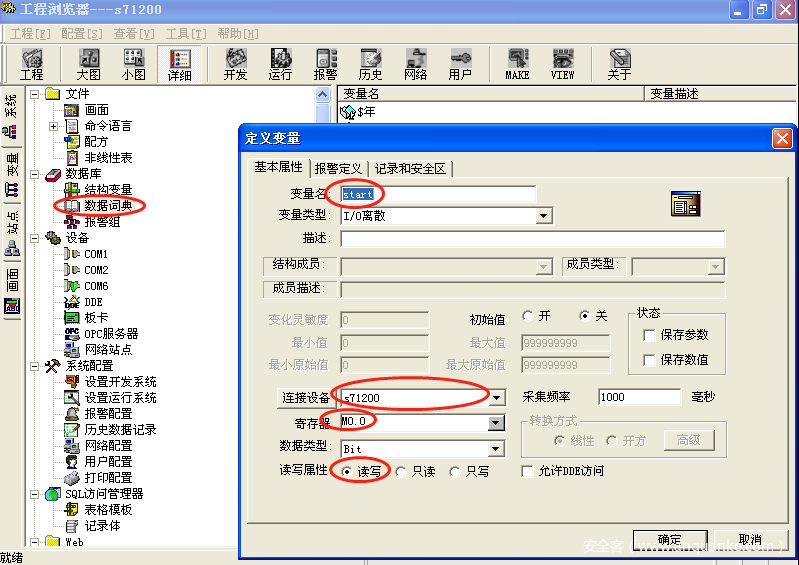 8)在数据库下的数据词典新建3个新变量,与下位机定义的变量相对对应,start、stop、out变量,如下图: