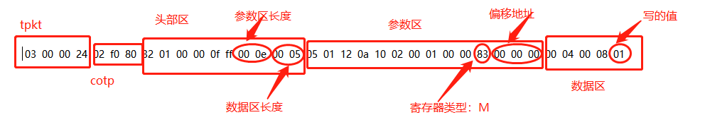 这个就是我们要构造的数据0300002402f080320100000fff000e00050501120a100200010000830000000004000801,通过对s7协议的了解,我们可以知道报文的含义为:写m0.0值为1。