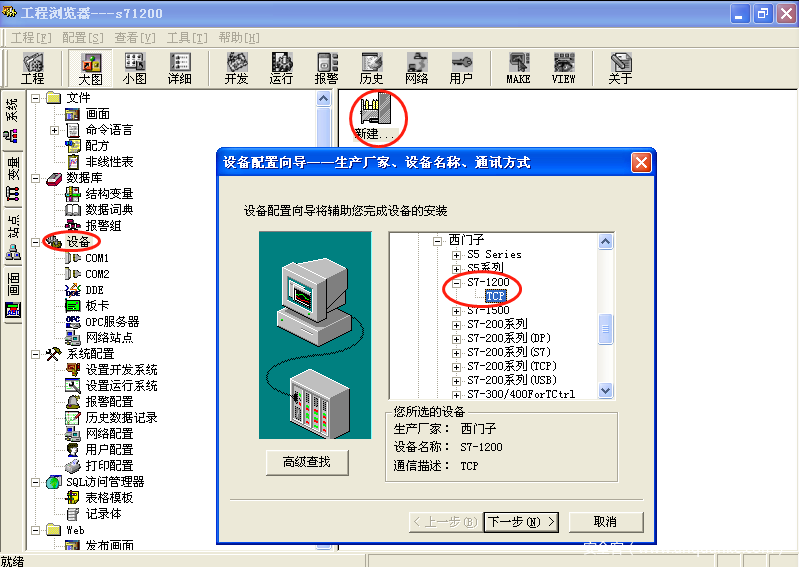 3)鼠标点击设备,在左面的对话框中有新建按钮,创建一个新的设备通讯,选择一种设备名称或者通讯方式,在本例程中选择西门子的s7-1200-TCP通讯方式,如下图: