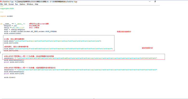 5)在操作机中新建文本命名为S7(M0.0 to 1),并修改扩展名为.py,以Edit with IDLE打开,并将上一步的数据包构造出,并进行保存,不关闭文件,如下图: