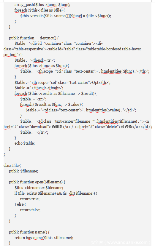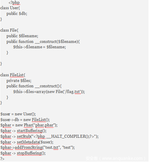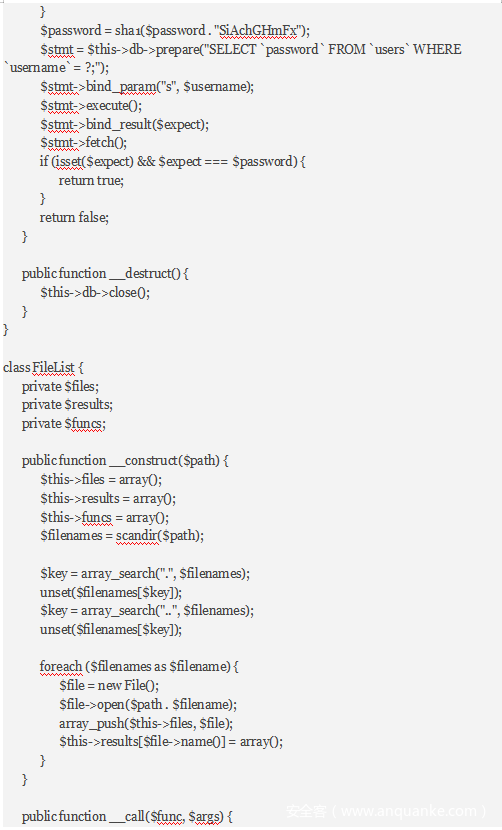继续看到class.php的File类的close()函数中调用了file_get_contents函数,可以读取文件。但是要怎么触发呢,我们可以看到FileList的__call函数,如果我们可以让FileList参数files为数组且数组中一个类为File,只要有类可以执行$FileList->close(),就可以读取文件并在FileList的析构函数中显示出来了。我们看到User类的析构函数,执行了$db->close()。so,我们让User的$db参数等于FileList就行了。