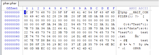 生成phar文件,使用16进制工具查看,可以看到Meta-data中的序列化对象
