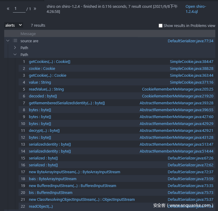 我们说过CodeQL并不能识别所有有关系的节点,所以在shiro这个例子中我在设置了getCookies和readObject这两个起点和终点后我还要找中间断的地方,我的方法是找了一篇分析shiro反序列化的文章,让我能知道变量在方法中的传递路径,然后设置source为getcookies,把sink沿着变量传递的链完后推,看断在哪里,最后找到需要连接的四个地方。