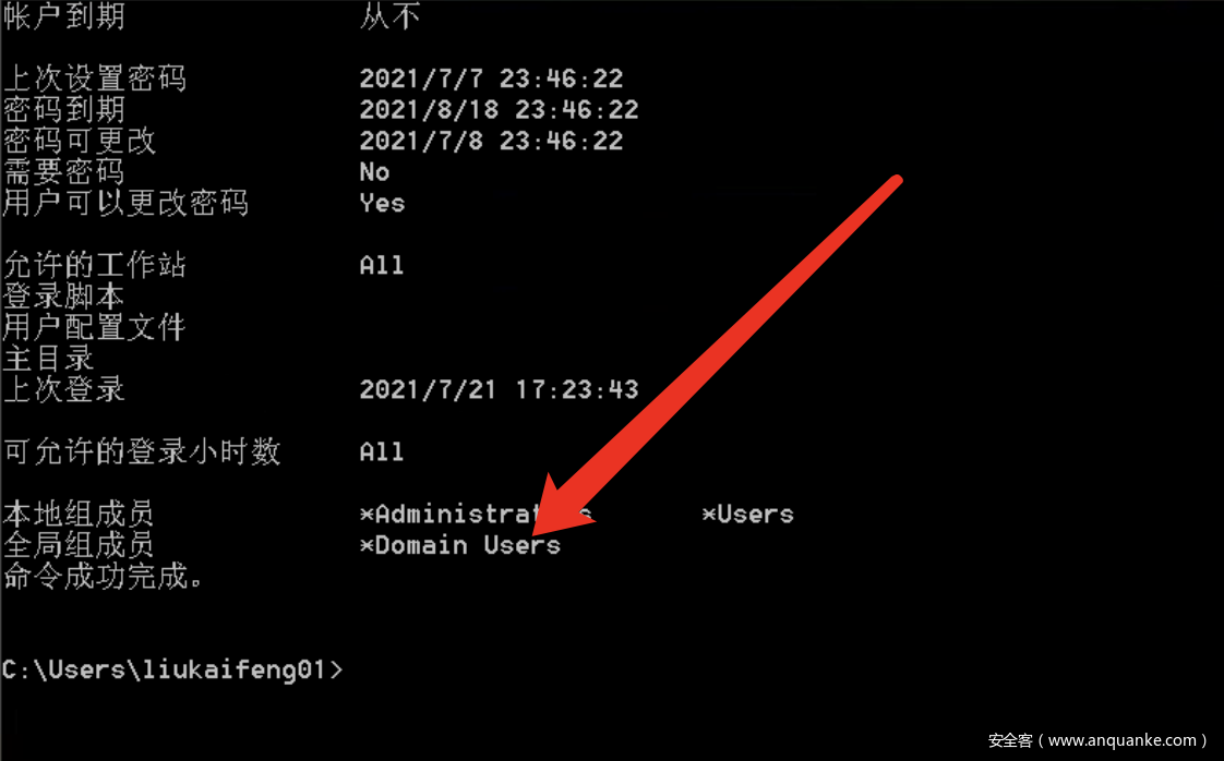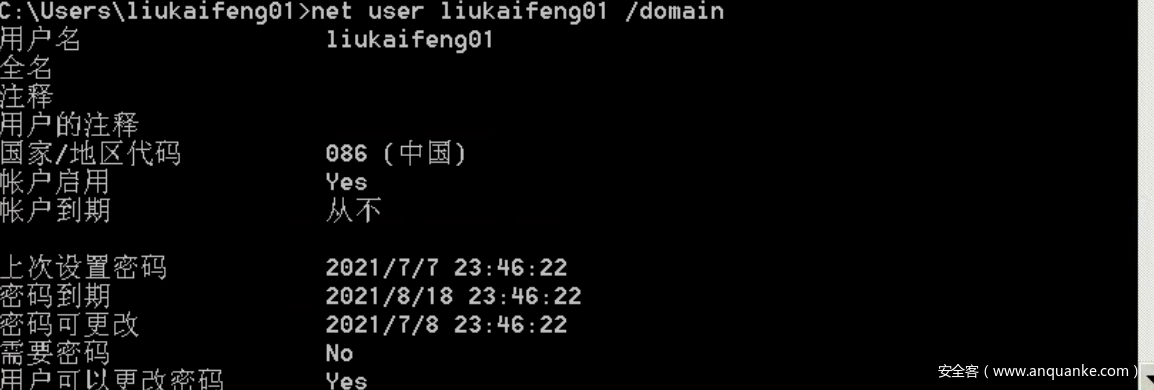 查看用户是否是域用户,当我们获取到 一台权限时,我们需要查看此权限是否为域用户。net user 用户名 /domain