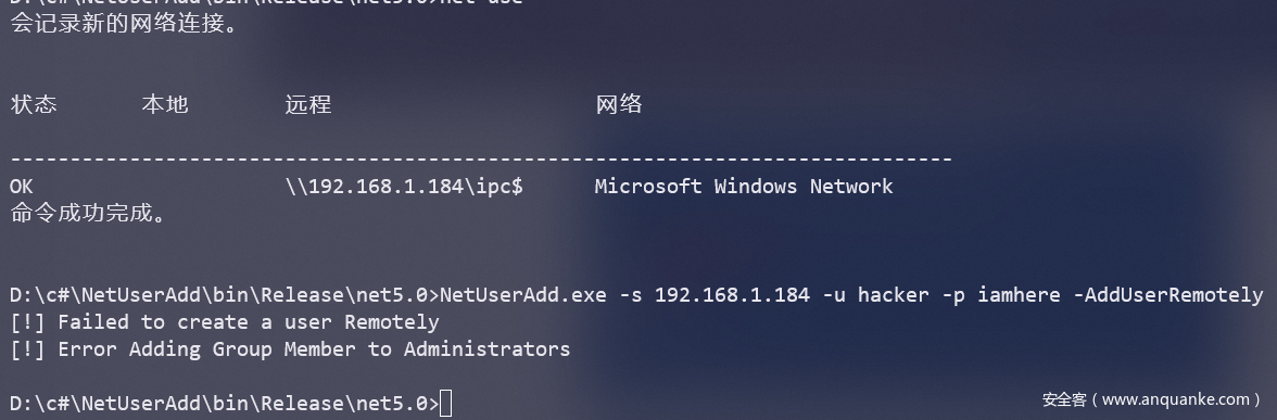 这里我的错误信息写的比较简陋,也没有写GetlastError,但稍想一下这里就不可能成功,又没有建立已知连接,也没有提供目标机器账户密码。那么这里API提供的servername到底有什么作用呢?或者如何才能远程执行添加用户的命令呢?