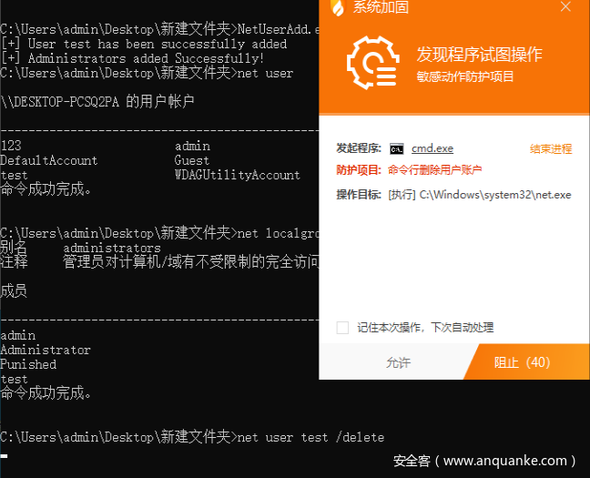 以前遇到杀软添加用户会被拦截,没想到删除命令同样遭到拦截,这不经引起了我的思考,这个操作能绕过吗?