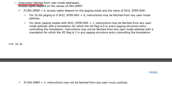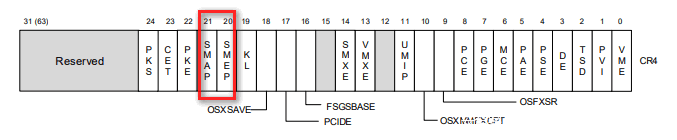 之后Bypass SMEP采用修改CR4寄存器,置其第21位为0。据笔者环境,CR4=00000000001506f8,应修改为00000000000506f8,Gadgets如下: